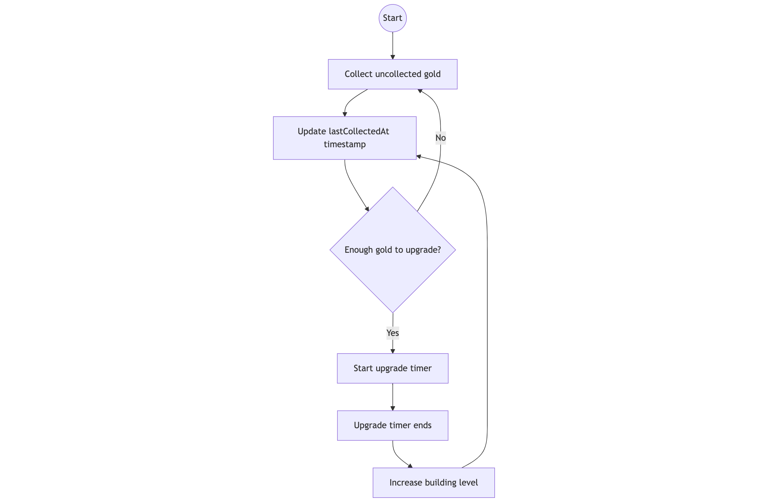 calculateGold(), based on time since last collection and capped by the mine’s level. - Upgrade system - When you upgrade, we deduct gold, set an upgrade finish timestamp, and block further upgrades until it completes. We check